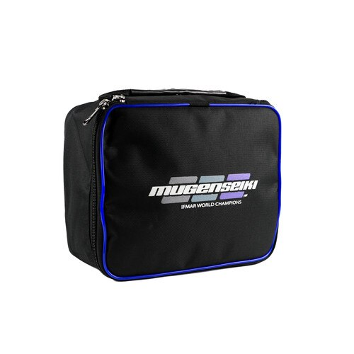 Here is the Mugen shock / diff oil and parts bag. This bag is made out of a durable nylon, has a heavy duty zipper and produced in a black color with blue piping. The bag measurements are: 9 ½” x 8” x 6 ¼” (approx..). The bag has a nice carrying handle on the top and features the Mugen Seiki World Champion logo!